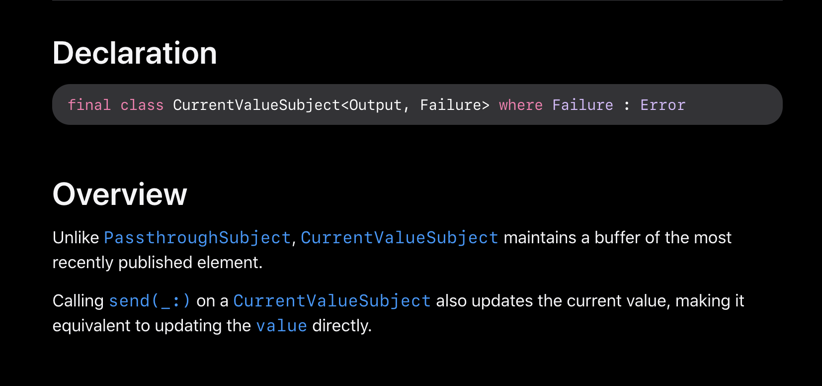 CurrentValueSubject는 final class로 선언되어 있으며, Output, Failure타입을 갖습니다.