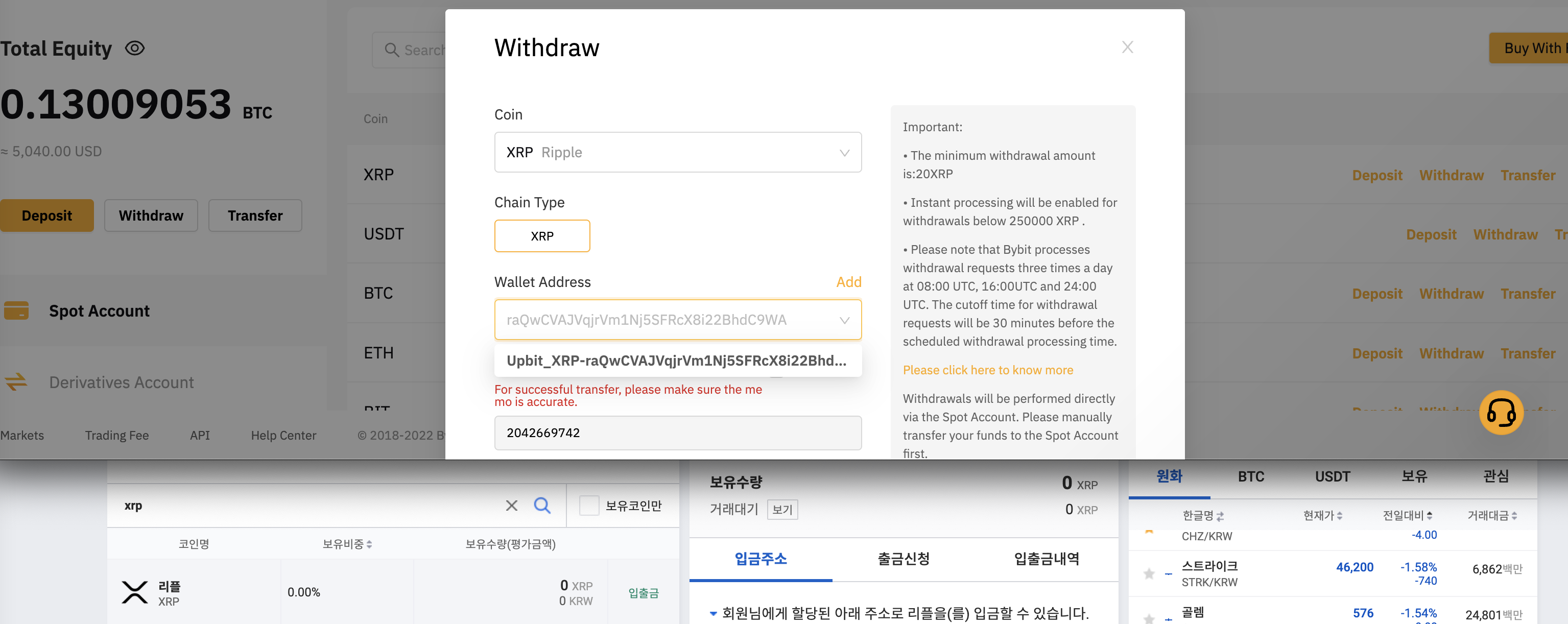 햇징개념을 이해하고 계신다면 리플 숏 + 매수한 현물 물량을 동일하게 대응하는 햇징을 활용해서 전송 간의 가격변동 리스크를 해소하고 보낼 수도 있겠습니다. 출금 신청 후, 일반적으로 5 ~ 10분을 기다리면 출금이 완료됩니다.