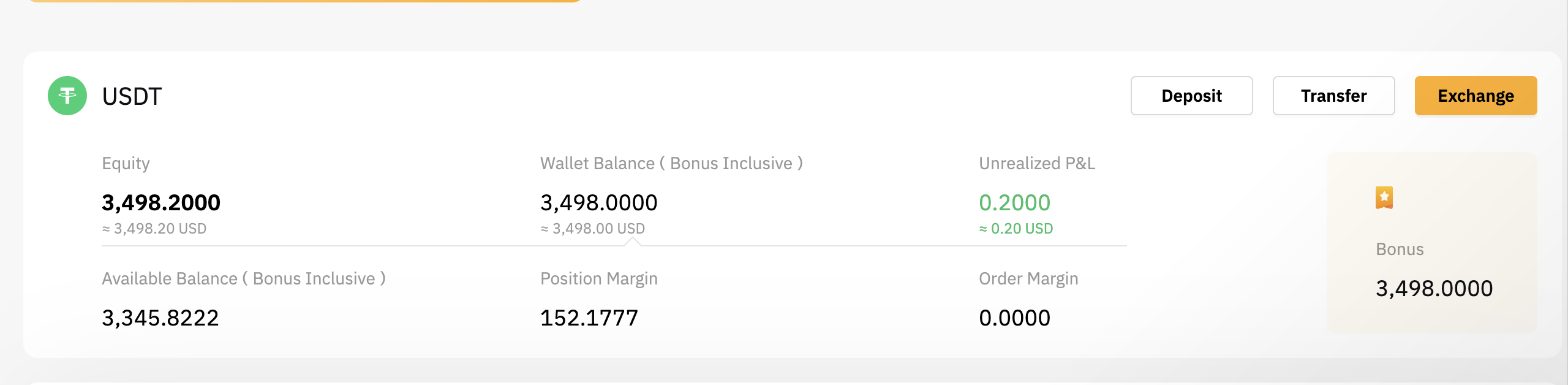 바이비트에서 제공하는 USDT 테더 보너스는 일반 현물, 자산과 달리 사용에 제약이 있습니다. 실제 자산처럼 사용할 수는 있지만, 보너스로 받은 USDT 테더는 선물거래용으로만 사용이 가능합니다. 현물거래가 불가능한 것이죠.