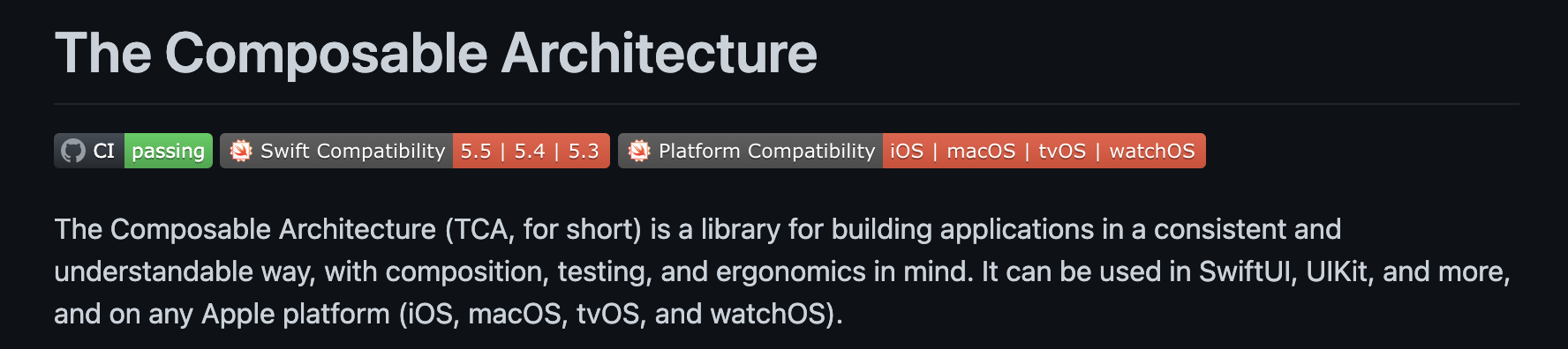 The Composable Architecture, 는 구성, 테스팅, 인체공학적으로 일관성있고 이해가능한 방식의 어플리케이션 빌딩을 도와주는 라이브러리입니다. TCA는 iOS, macOS, tvOS, watchOS 등의 다양한 플랫폼에서 SwiftUI, UIKit 등을 활용하여 사용할 수 있습니다.