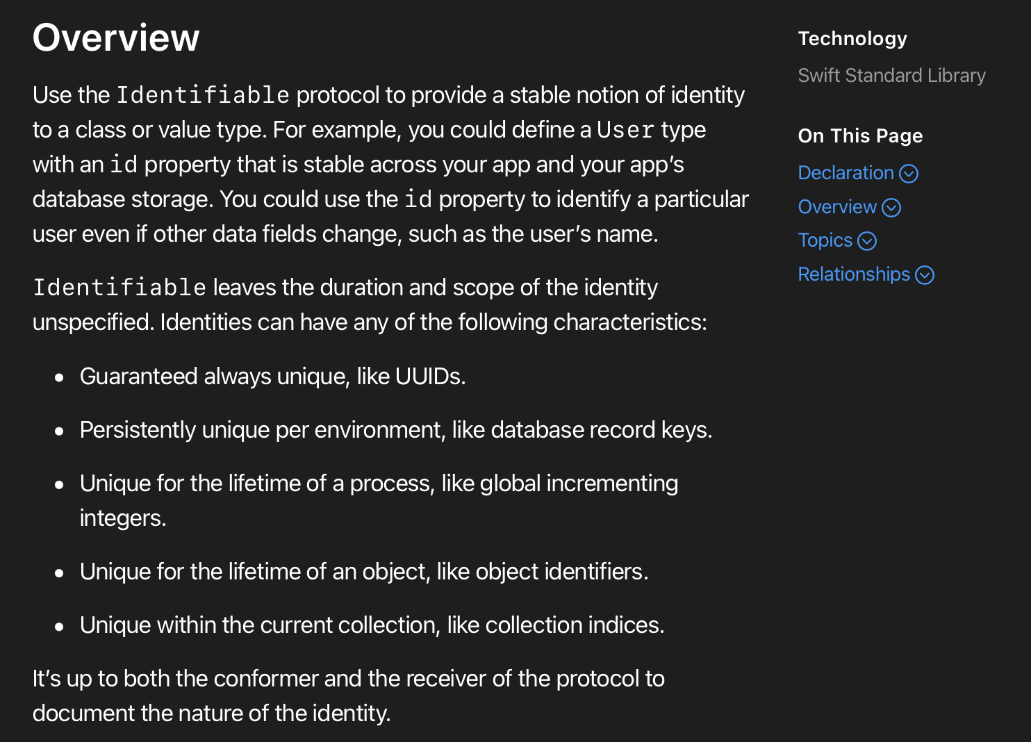 그 예를 들자면, 앱과 앱의 DB 저장소등에 걸쳐 안정적인 프로퍼티, id를 가진 User타입을 정의할 수 있습니다. (이때 User타입은 Identifiable프로토콜을 채택하게 됨) 이후 User타입의 name필드와 같은 데이터 필드가 수정되는 경우 등에 특정 User타입 인스턴스를 구분하 수 있는 id 프로퍼티를 사용가능합니다.
