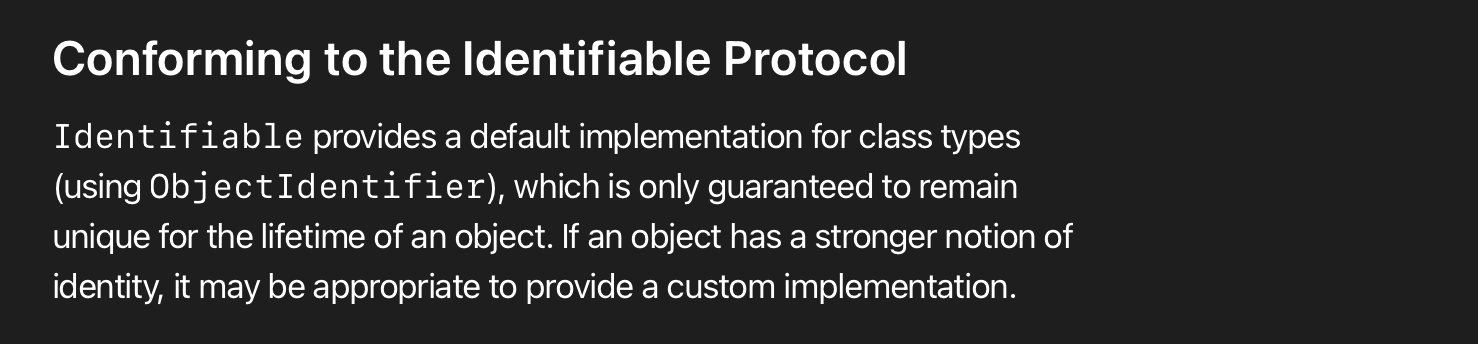 Identifiable 프로토콜은 class 타입(ObjectIdentifier를 사용하는)을 위한 기본 구현을 제공하고 있습니다. 이는 객체가 살아있는 동안 고유성을 유지하는 것을 보장해줍니다. 만약 어떤 어떤 객체가 강한 신원 개념을 지니고 있다면, 이에 대한 커스텀 구현을 제공하는 것이 적절할 수 있습니다.