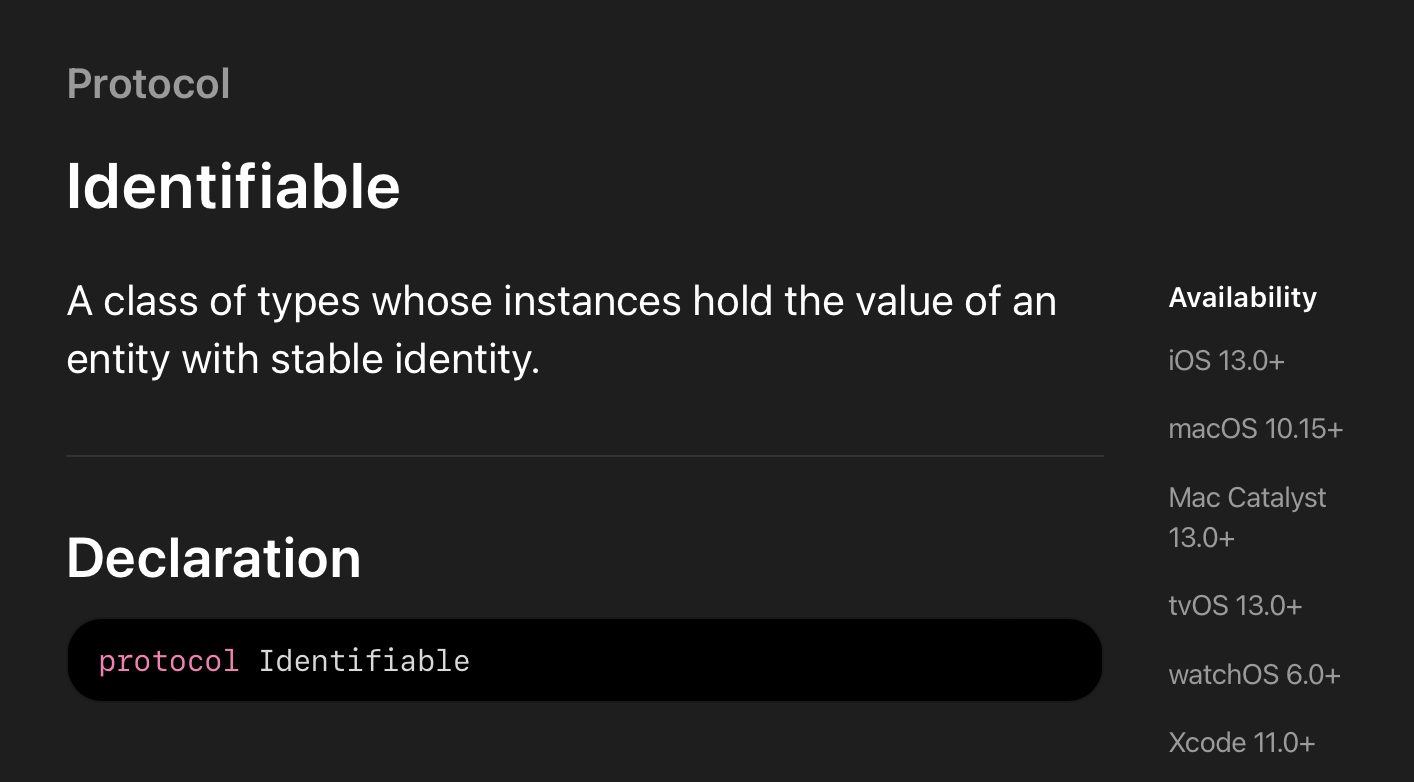 Identifiable은 Combine, SwiftUI 프레임워크가 탄생한 iOS13 이후부터 사용이 가능한 프로토콜이며, Xcode 11.0버전 이상에서 사용이 가능합니다.