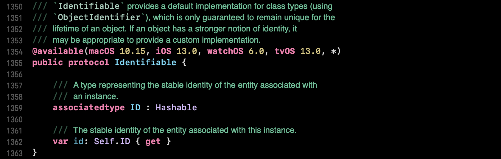 1361 line) Identifiable 프로토콜을 채택하는 타입의 ID 읽기전용 변수를 규약으로 정의하고 있습니다. 이 변수는 인스턴스와 관련된 개체의 독립적 신원을 표현합니다.