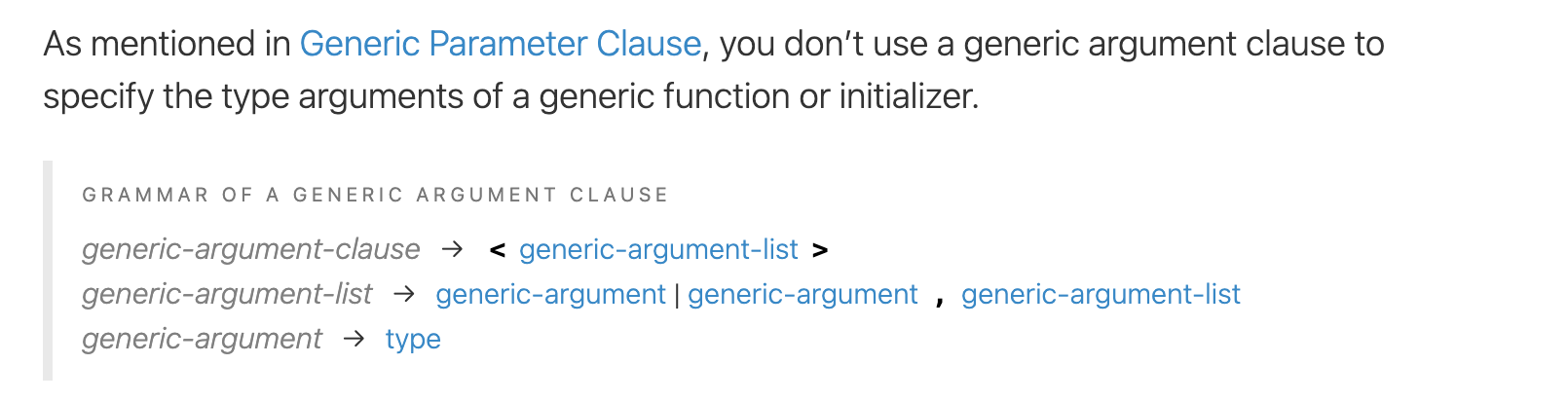 Generic Parameter Clause 파트에서 언급했듯이, 제네릭 함수나 생성자 등을 사용 시에 <> 꺽쇠와 같은 제네릭 인자 절을 명시할 필요가 없습니다. 일반 함수와 같이 인자를 넣어 사용하면 인자 타입을 자동으로 추론하여 함수를 실행합니다.