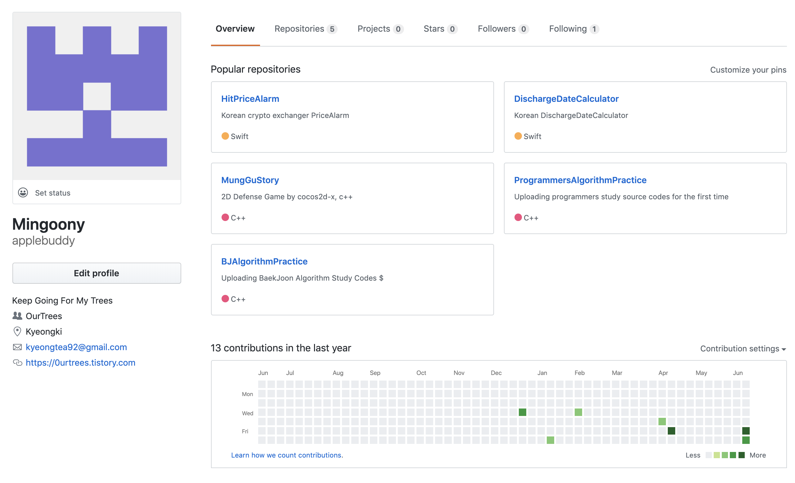 위 이미지를 보시면 제 깃주소에 무사히 BJAlgorithmPractice Git 저장소가 생성된 것을 보실 수 있습니다. 제가 알고리즘은 C++언어로 공부를 하는데 C++표시도 제대로 되어있군요.