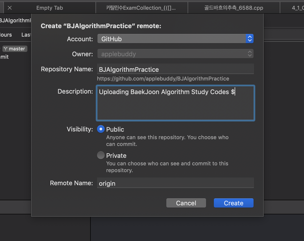 먼저 깃버킷, Git, Github 등등 중에 사용하실 깃 서비스를 선택하고 계정을 연동 후 Description(설명), Visibility(공개,브라이빗(깃헙의경우 유료))를 선택 후 Create를 클릭합니다. Remote Name은 생성 뒤 깃프로젝트의 RemoteName으로 생성됩니다.