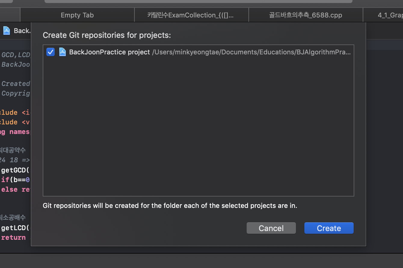 위와같이 깃 저장소(Git Repository)를 만들 프로젝트를 선택하고 Create를 클릭해줍니다.
