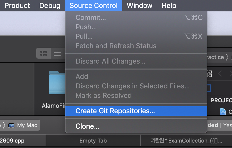 Xcode를 띄운 상태에서 상단바의 Source Control -> Create Git Repositories... 를 클릭해줍니다.