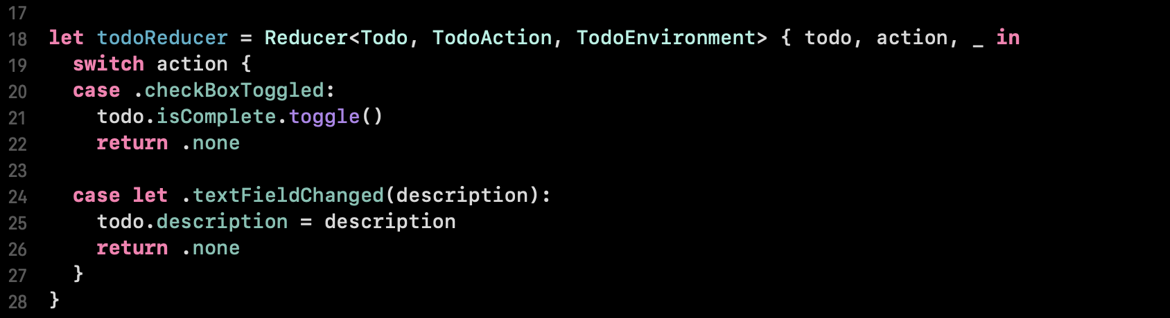 Todo앱의 State, Action에 따라 변경될 Todo(State), TodoAction(Action), TodoEnvironment(Environment)인자와 그 인자 값에 맞게 실행 될 코드, 반환 될 Effect 등이 정의되어있습니다. 위 코드 의 경우, 모든 케이스에서 특정 Effect로 .none을 반환하고 있는데, 이는 이후 추가 Action을 필요로 하지 않을때 반환할 수 있습니다. 만약 추가 Action 수행이 필요한 경우, 해당 Action case를 value로 갖는 Effect를 반환하여 추가로 Action을 수행하게 됩니다.