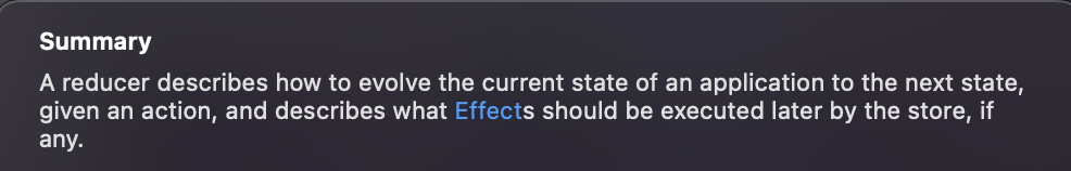 Composable Architecture의 구성 요소 중 하나인 Reducer의 Quick Help(내부 코드의 주석을 통해 볼 수도 있습니다.)를 통해 볼 수 있는 Reducer의 개요내용을 보겠습니다.
