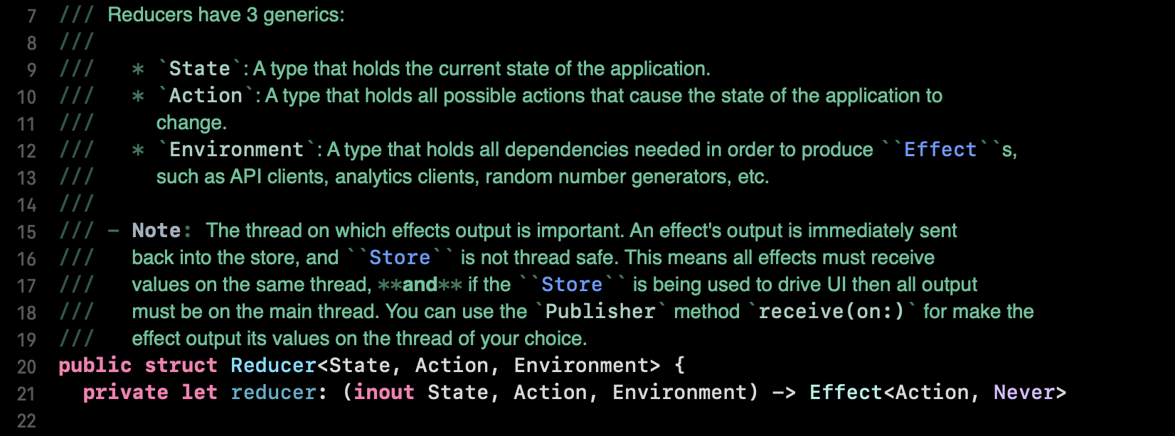 Reducer는 3개의 제네릭 인자를 가진 구조체로 선언되어있습니다. 제네릭 절에 정의된 제네릭 인자는 각각 State, Action, Envirionment입니다. Reducer의 Quick Time, 정의 코드 부의 주석을 보면 제네릭 인자 각각의 역할에 대한 설명이 있습니다.