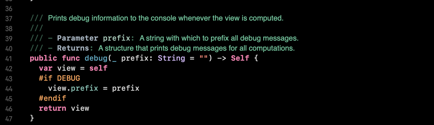 WithViewStore 구조체에서 사용가능한 함수가 있는데, debug(_:) 함수입니다. 메서드 명과 같이 현재 업데이트되는 viewStore값을 debugging하고자 할때 활용할 수 있습니다.