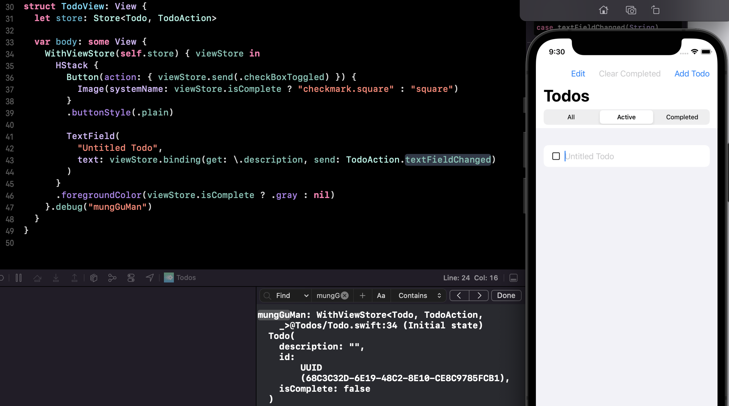 pointfree의 The Composable Architecture 샘플 프로젝트 중 Todo 샘플앱 코드의 WithViewStore 구조체에 debug 메서드를 붙여 사용해본 예시입니다. 변경된 viewStore 값이 출력되며, prefix로 설정한 값이 함게 나오는 모습을 보실 수 있습니다.