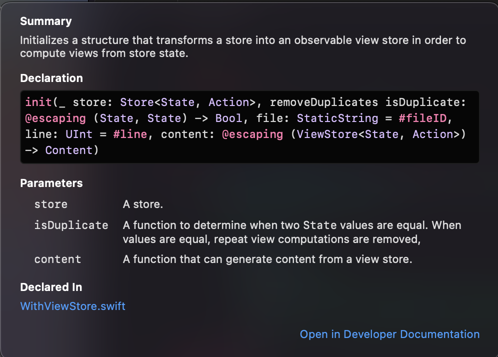 WithViewStore 구조체의 생성자 선언형태는 위와 같습니다. State, Action 제네릭 인자 리스트를 갖는 Store 타입을 기본 인자로 받고, 그 외 isDuplicate, content 등의 인자를 갖고 있습니다. 각 인자에 대한 간략한 설명은 아래와 같습니다.