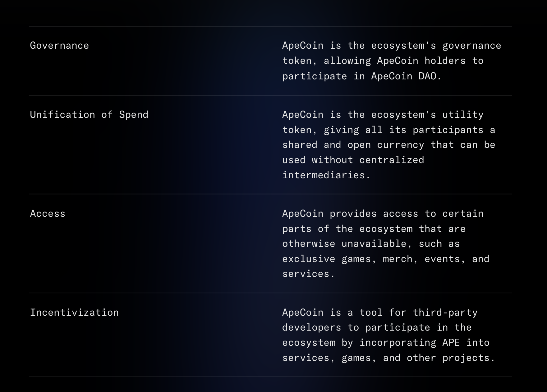 Ape코인은 생태계 내의 유틸리티 토큰으로 모든 참여자들에게 공유되고 개방된 통화로서 제공됩니다. 이는 중앙집권화된 중재자 없이 사용이 될 수 있습니다.