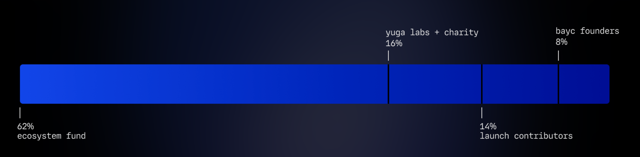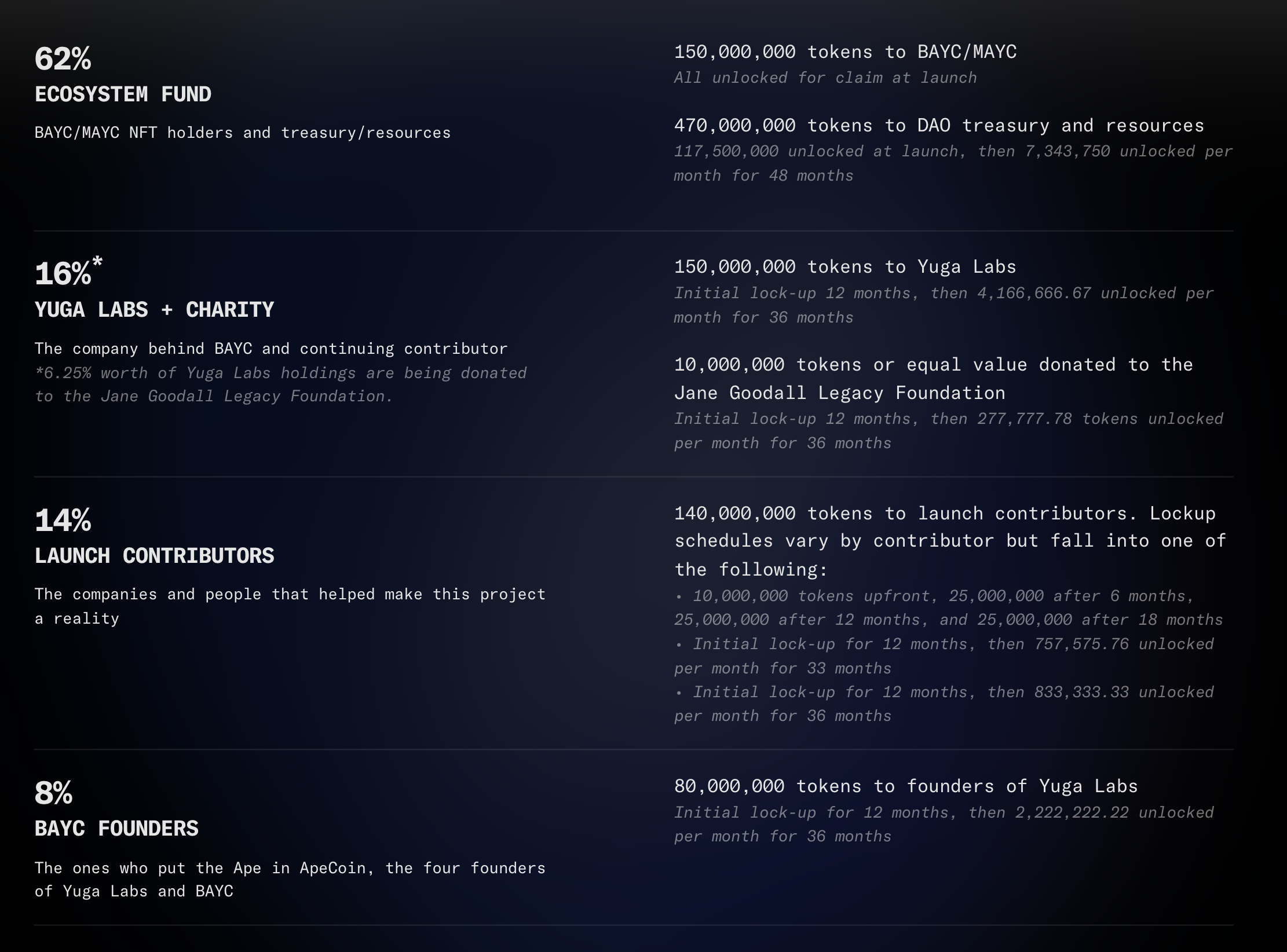 Ape코인은 아래 차트 상세내용과 같이 4가지의 주 그룹으로 나뉘어 분배가 될 것입니다. DAO 재무 및 자원에 할당 된 지갑 보유 토큰들은 여기를 통해 확인 가능합니다. (분배 비율 : 62% - 생태계 자금 / 16% - YUGA LABS(블록체인 스타트업) + 자선단체 / 14% - 시작 기여자들 / 8% - BAYC(Bored Ape Yacht Club) 설립자들)
