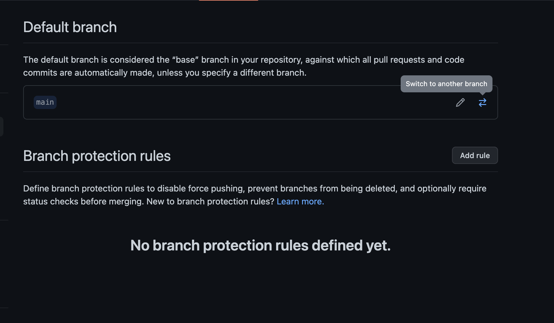 이어서 나오는 페이지에서 Default branch 상태를 확인할 수 있습니다. main으로 되어있는데, 우측의 화살표 교차 버튼를 갖다 대면, Switch to another branch 문구를 보실 수 있어요. 이걸 눌러주세요.