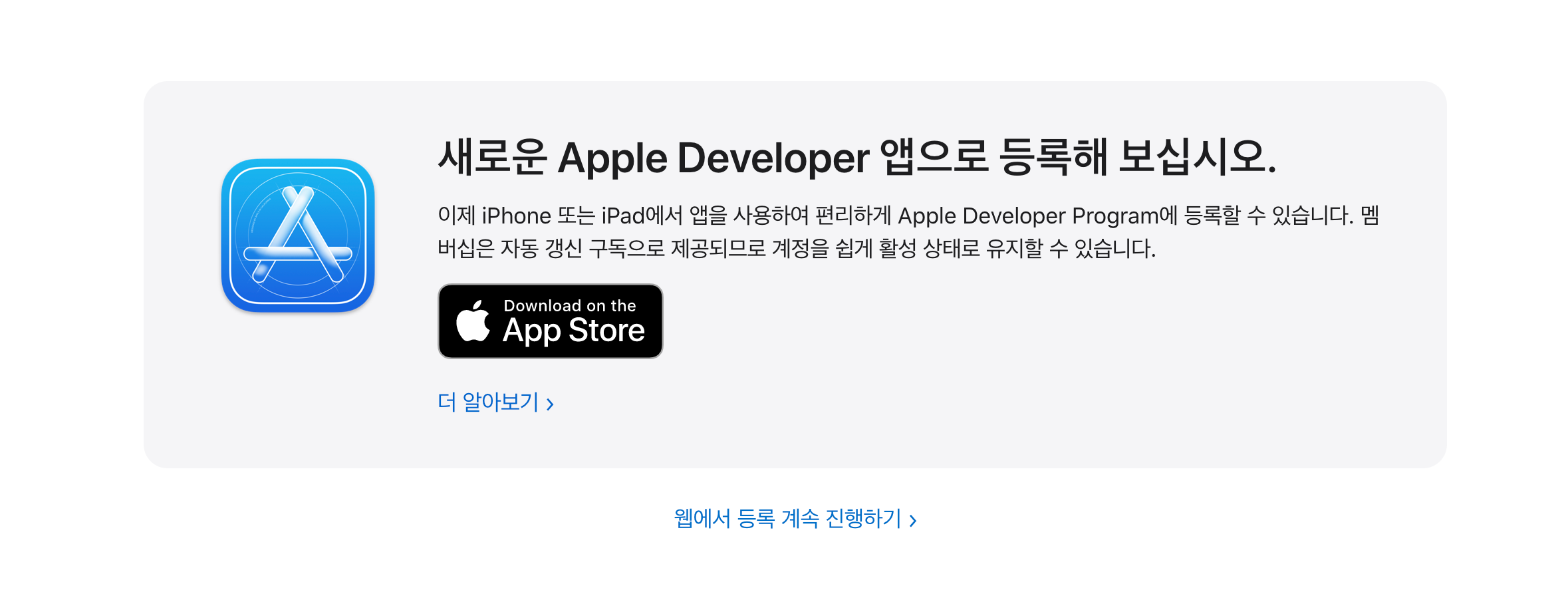 Apple Developer 앱으로도 등록할 수 있다고 합니다만, 저는 웹으로 그대로 진행하겠습니다. 하단의 [웹에서 등록 계속 진행하기] 버튼을 선택해주세요.