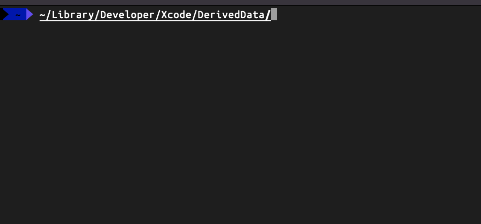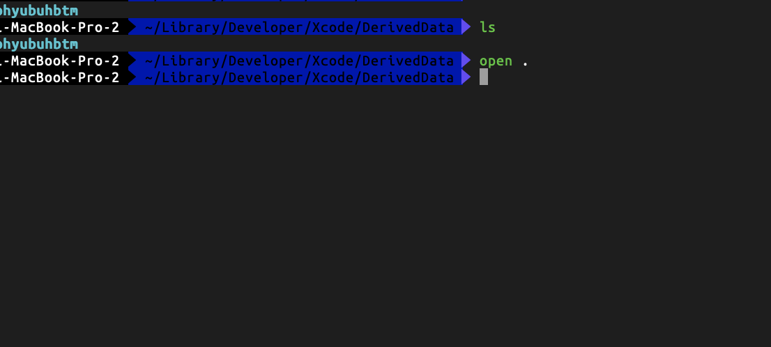 cd ~/Library/Developer/Xcode/DerivedData/ 를 입력하면 DerivedData 폴더 경로로 이동이 됩니다.