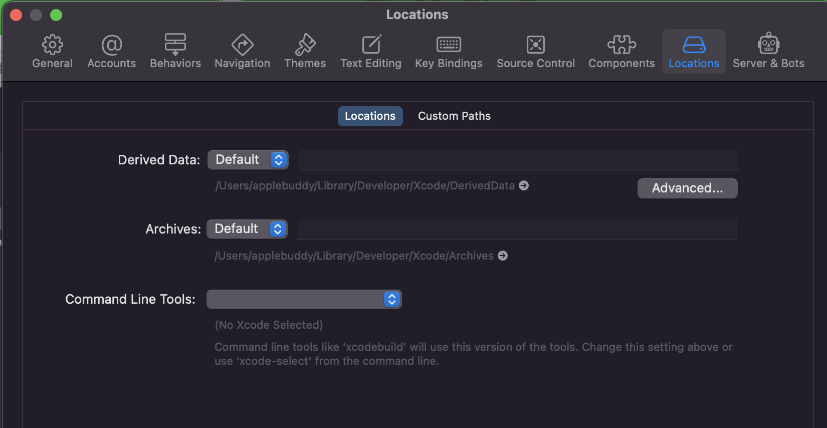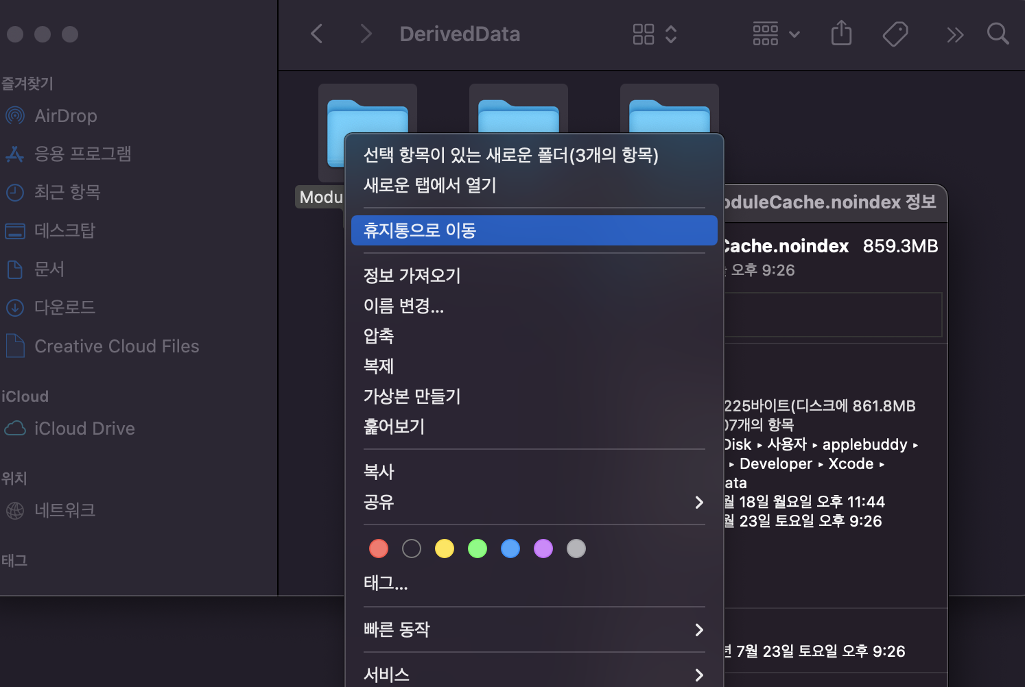 이후 Xcode의 Preferences 메뉴를 통해 DerivedData를 제거했던 것과 동일하게 제거를 해주시면 됩니다.
