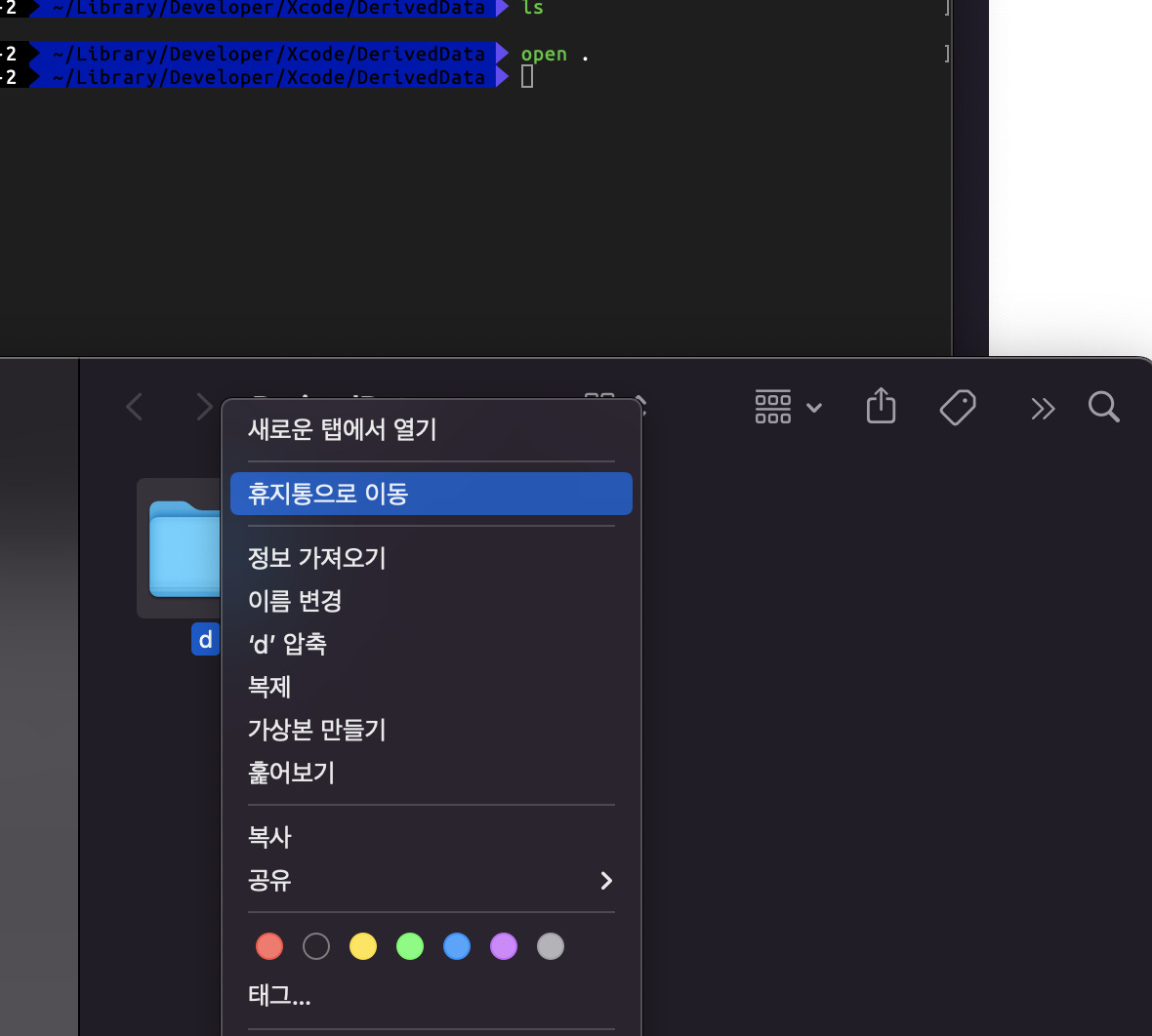 다른 방법으로도 Derived Data 제거가 가능합니다. 터미널로 제거하는 방법도 보겠습니다.