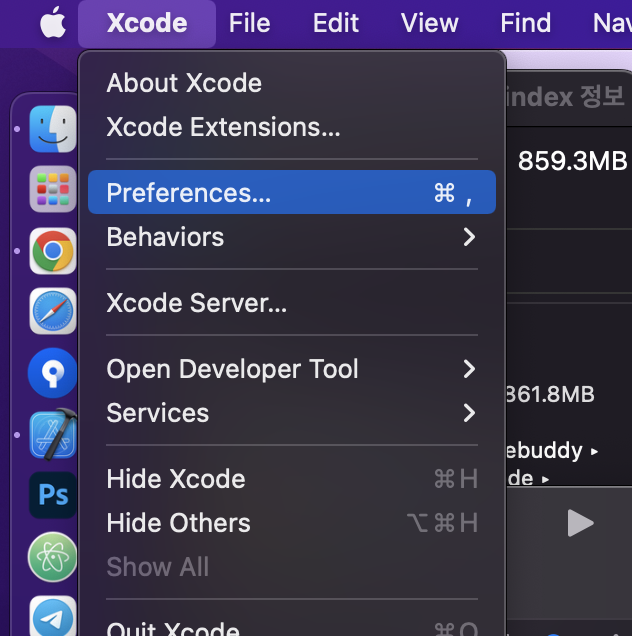 Xcode를 켠 상태에서 상단 Xcode > Preferences를 선택해주세요.