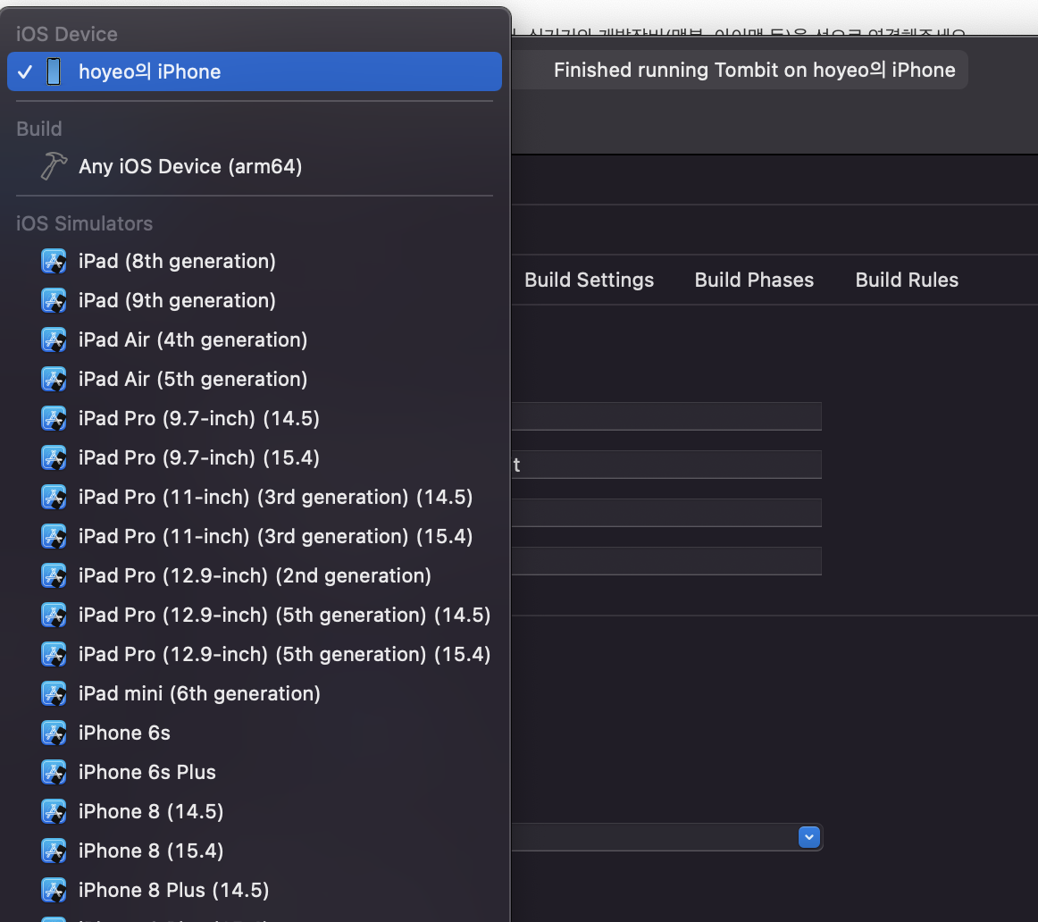 이후 실기기의 선을 제거 후에 무선연결 상태로 프로젝트 앱 빌드 및 실행이 잘 되는지 확인해보시면 됩니다. 무선연결이 정상적으로 되었다면, 앱이 정상적으로 빌드 및 실행(command + R)되는 것을 확인 가능합니다.