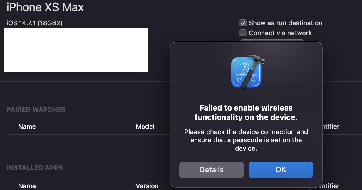 간혹 위와 같은 에러팝업이 발생하는 경우도 있습니다. 이 경우에는 좀더 시간을 기다려보거나, 유선연결상태로 빌드 및 실행(commnad + R)을 한번 한 뒤 재시도를 해보세요.