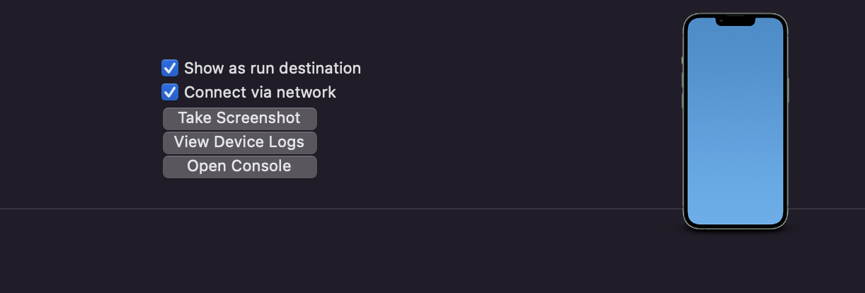 아이폰 실기기를 유선연결한 상태에서 command + shift + 2 단축키를 눌러서 위와 같은 화면을 띄워줍니다. 여기에서 중앙에 있는 Connect via network(네트워크를 통해 연결) 문구를 확인해주세요.