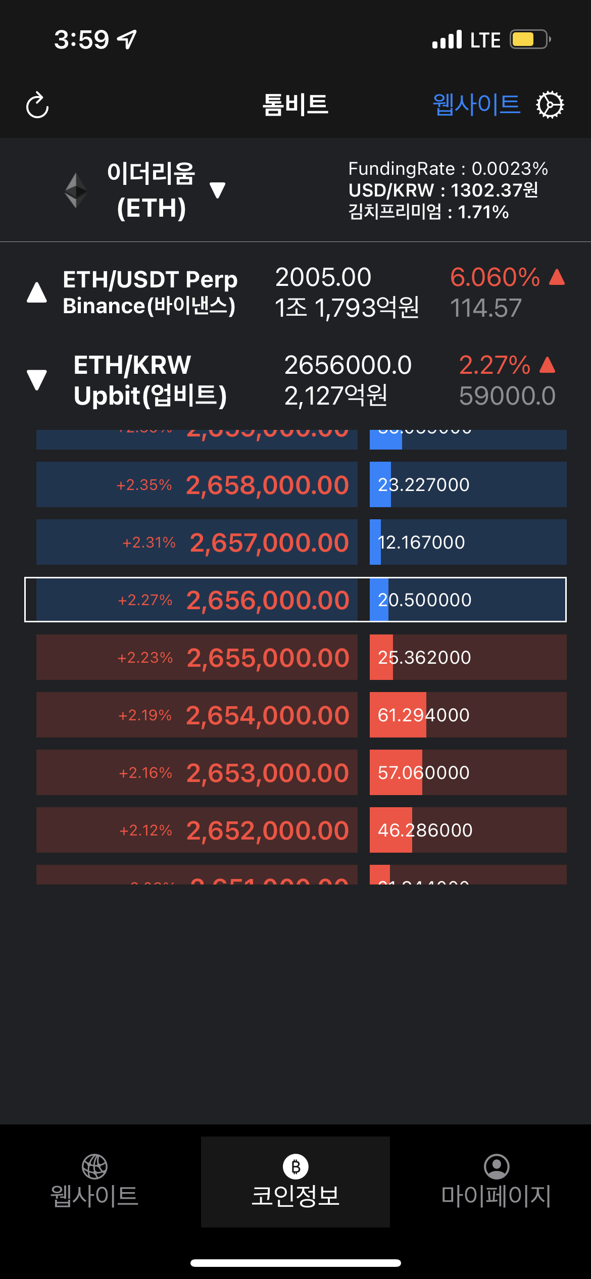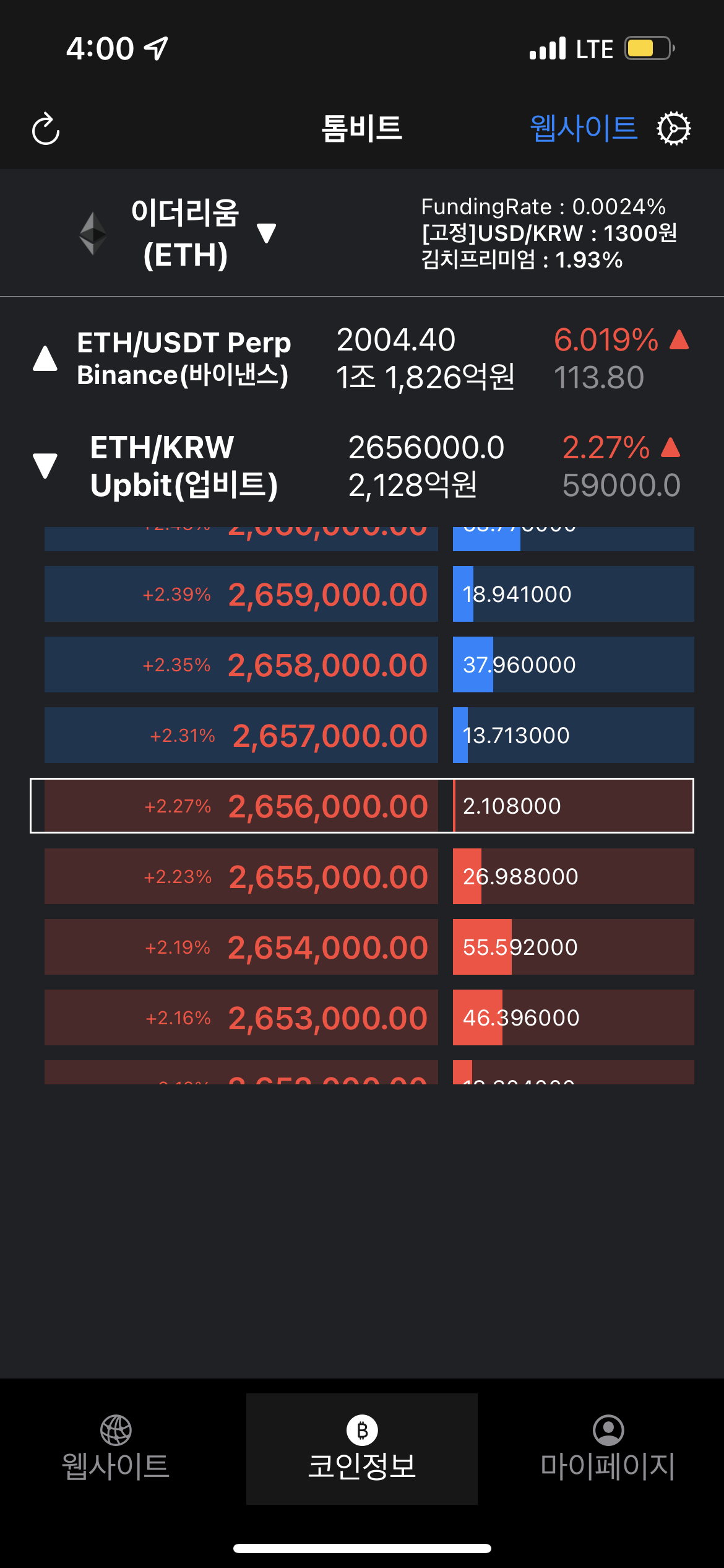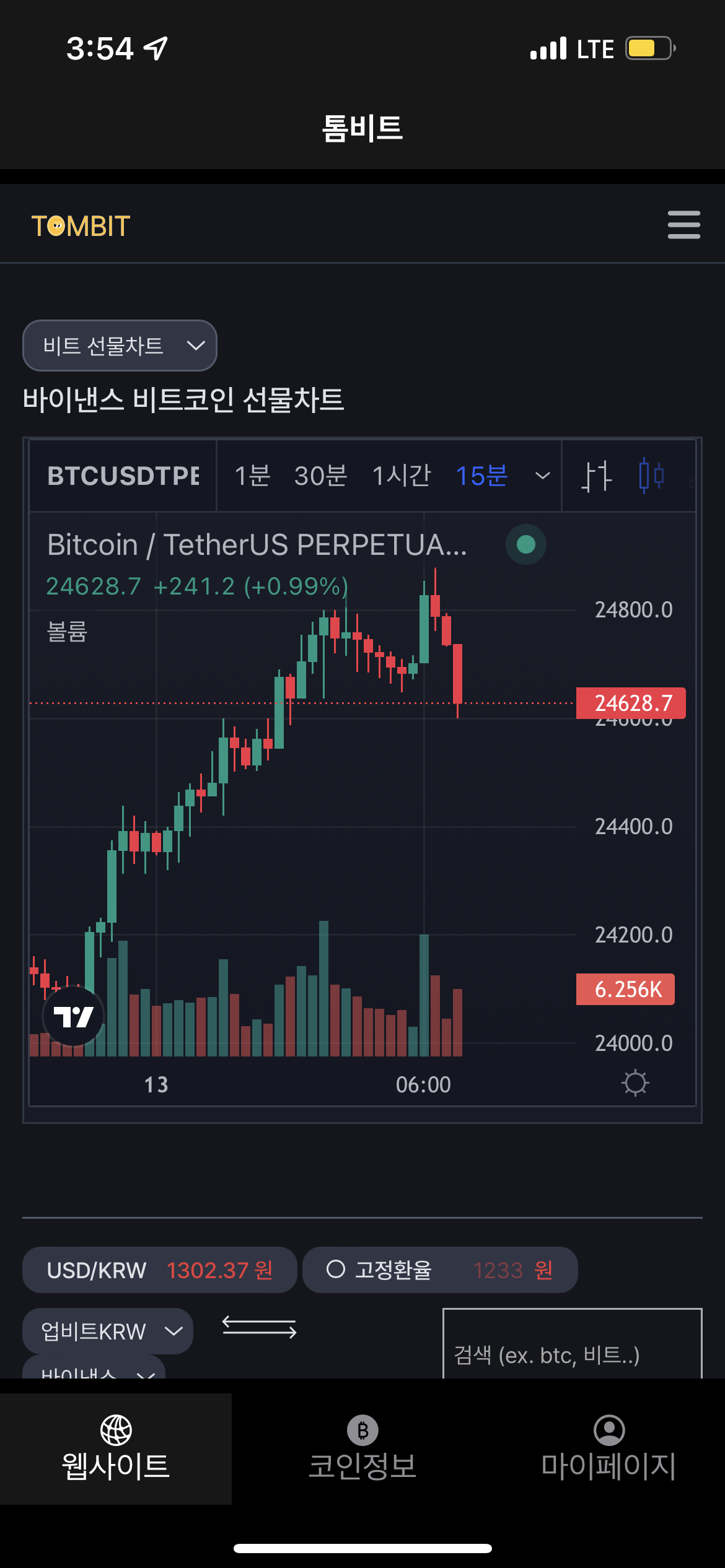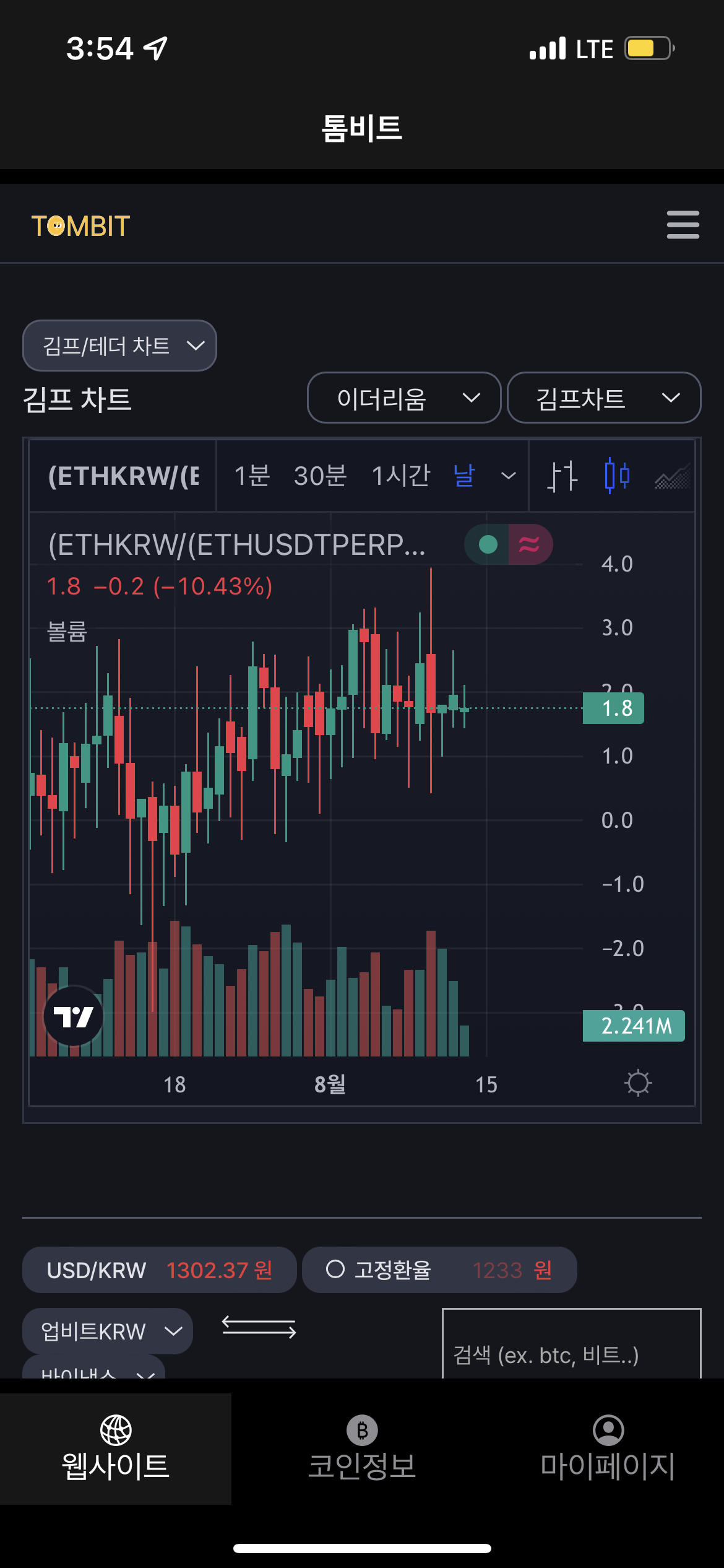 웹페이지 탭에서는 기존 톰비트 사이트에서 제공하는 정보를 확인 가능합니다. 다만, 모바일 대응이기에 일부 차트는 옵션을 선택해서 선택적으로 확인이 가능합니다.