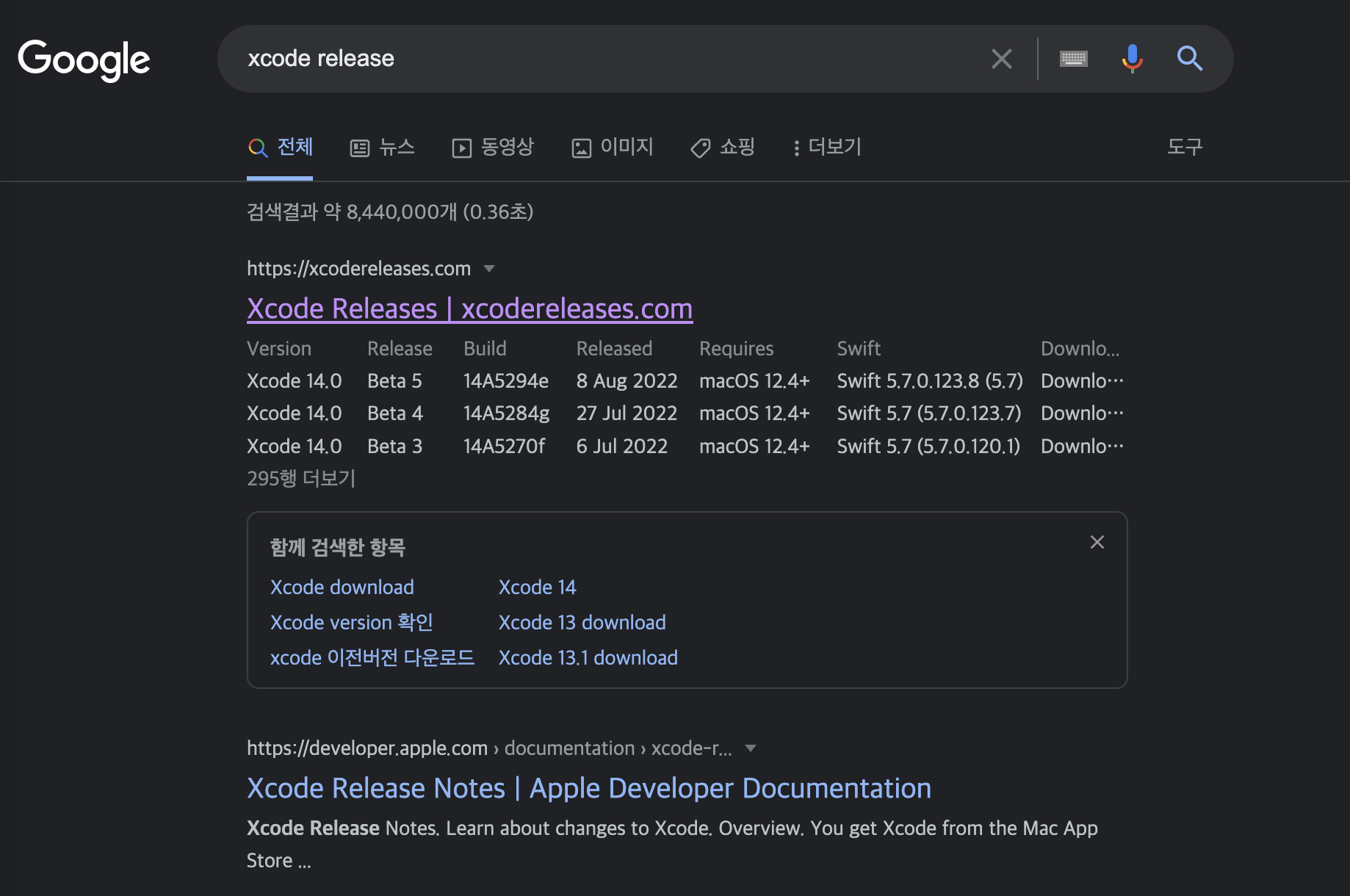 구글에서 "xcode release" 를 검색하시면 위와 같은 사이트가 나옵니다. xcodereleases.com 사이트를 들어가줍니다.