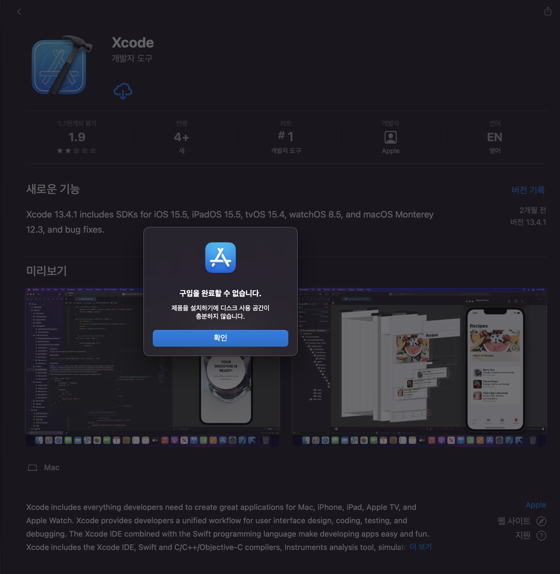 이건 자투리 팁인데요. Xcode 설치를 하는데 위와 같이 구입을 완료할 수 없는 경우가 있는데, 보통 디스크 여유공간이 45GB 이상이 되면 설치가 가능하다고 하니 참고하세요. (실제로 저도 45GB 여유공간을 만들고 설치가 가능했습니다.