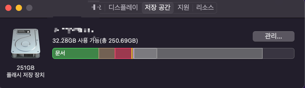 macOS 좌상단의 사과 로고 -> 이 Mac에 관하여 -> 저장 공간 을 선택해주세요.