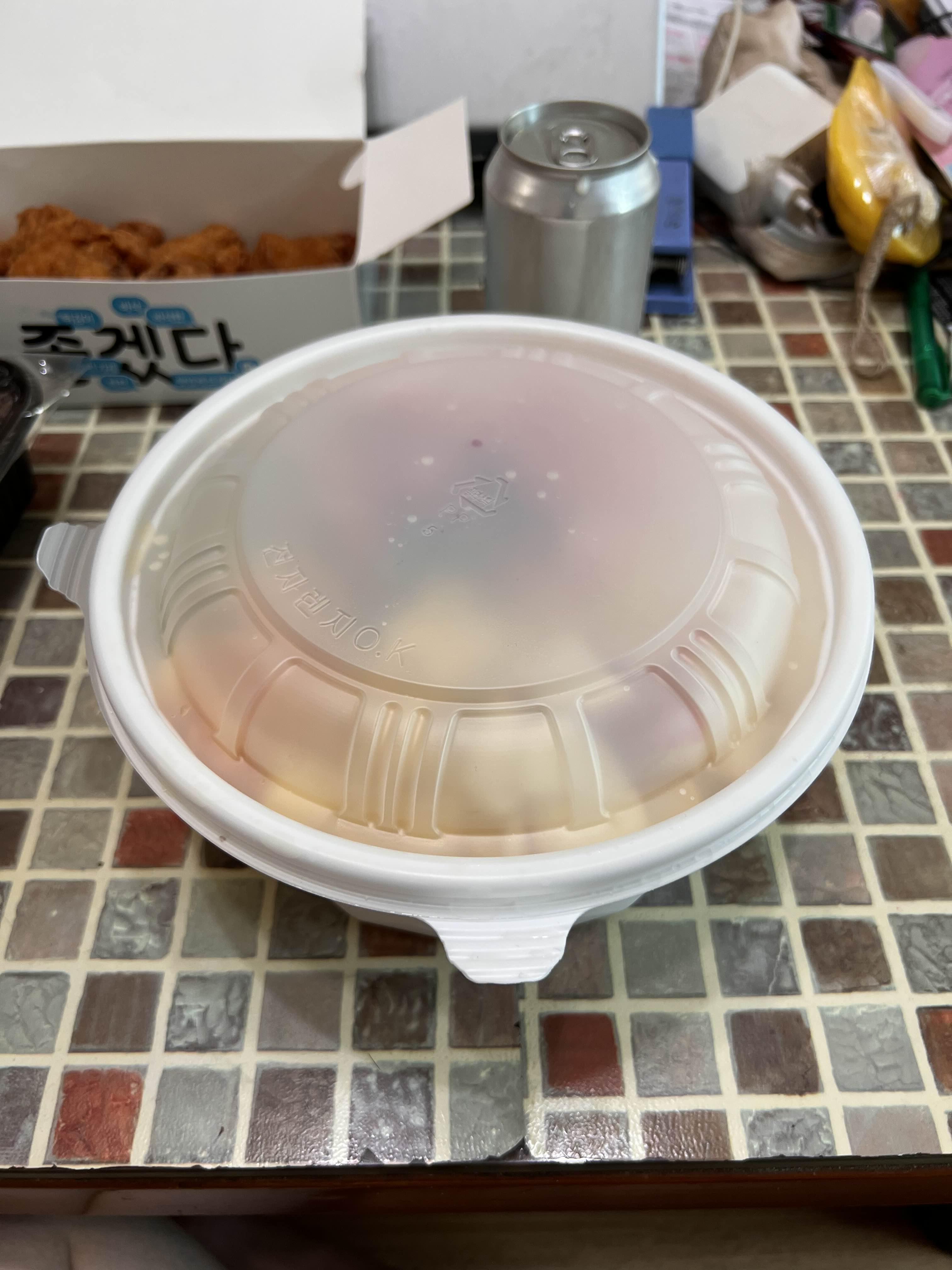 빙수는 위와 같이 포장재로 둘러쌓여 있었습니다. 빙수에 뿌려먹을 것으로 보이는 후레이크도 보이네요. 국물떡볶이는 여느 가게에서 주문했을때에도 자주 볼 수 있는 포장 비주얼 이었어요.