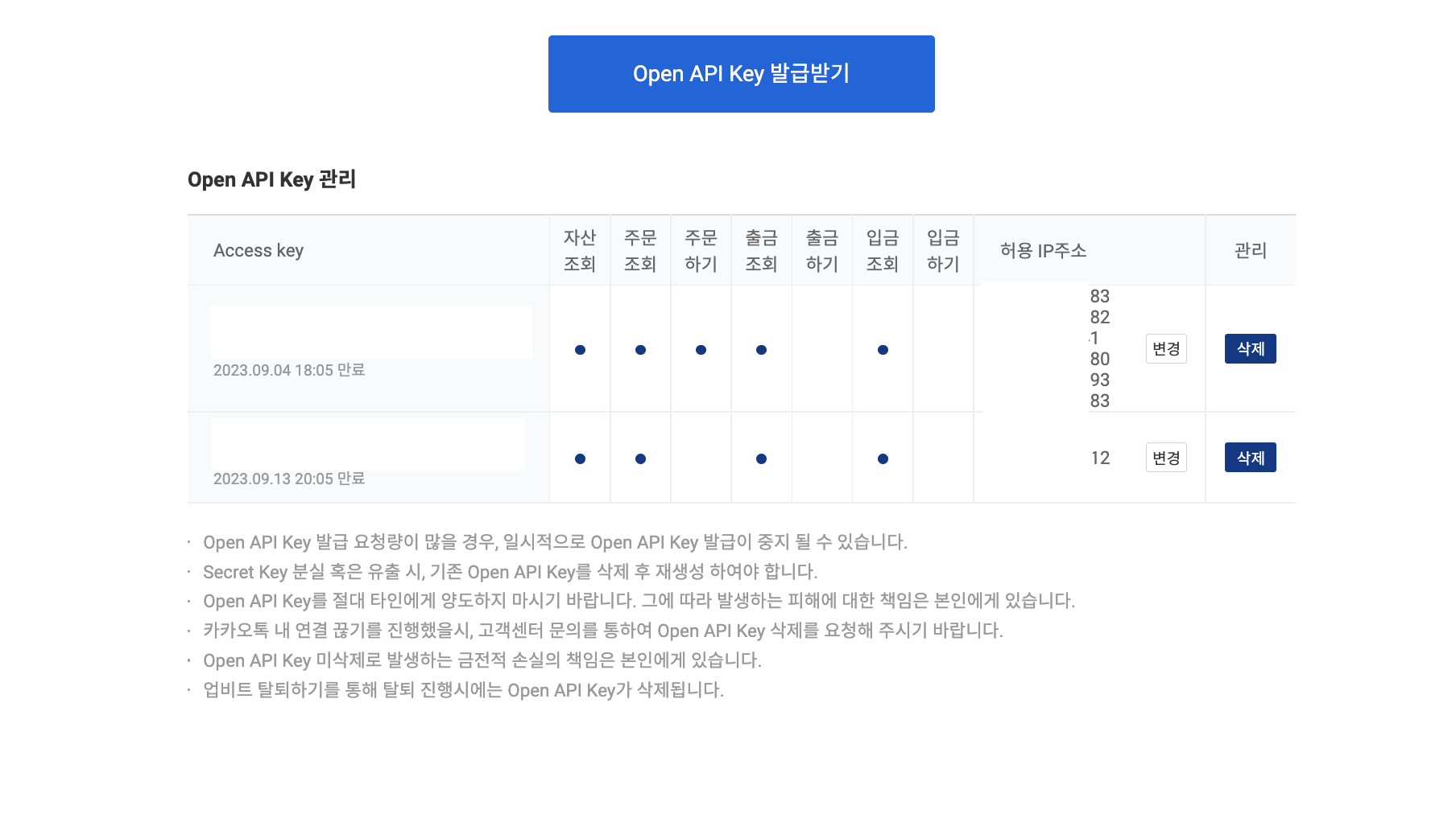 이외 주문하기 권한 등을 추가 시에 해당 API 키 정보를 탈취당할 경우, 위험해질 수 있으니 신중하게 고민하신 뒤 선택하셔야 합니다.