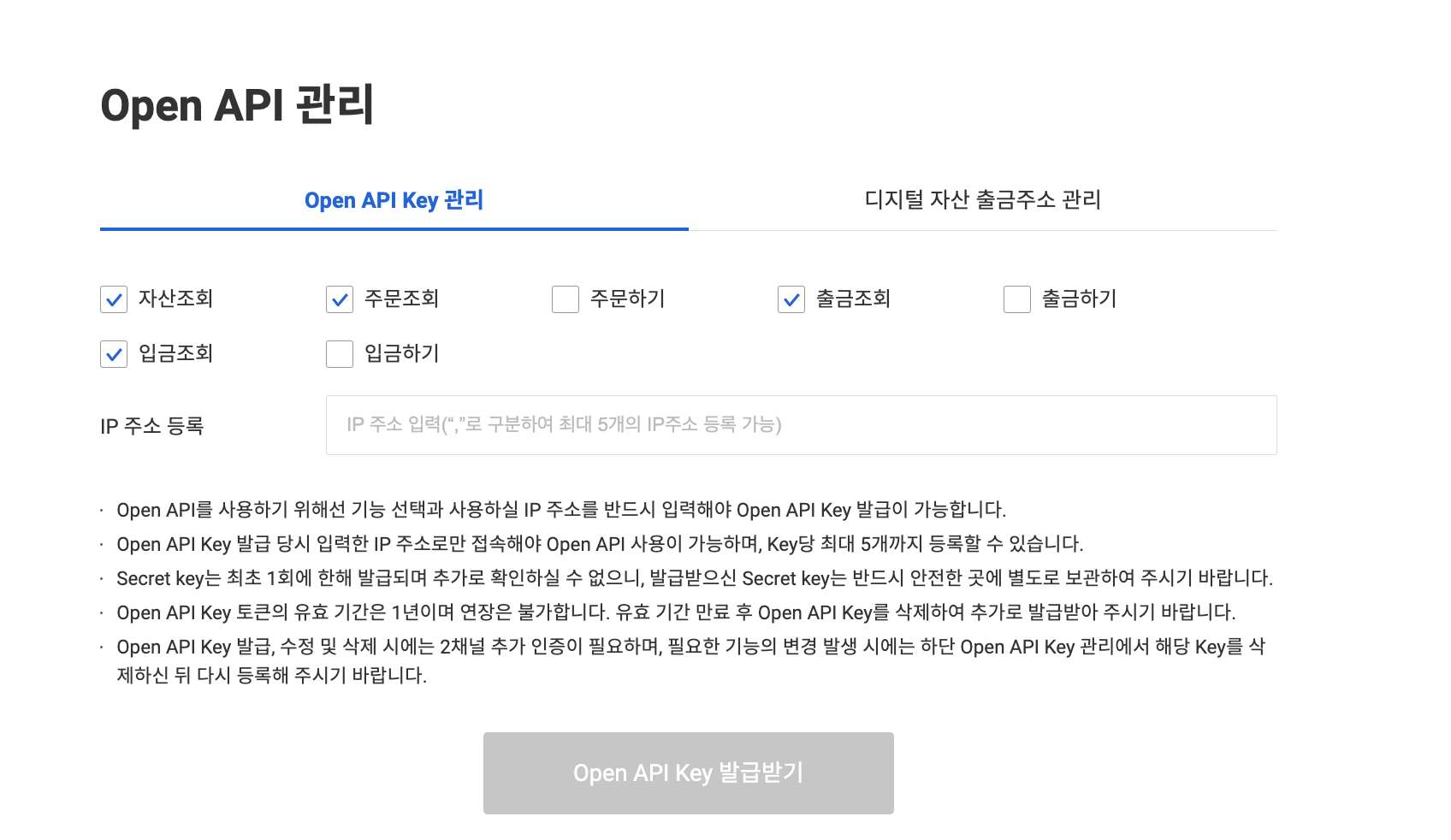 Open API 관리 페이지에서 Open API 키를 생성할 수 있습니다. 먼저, 발급받을 Open API 키의 권한을 설정하셔야 합니다. 만약 단순 자산, 주문, 입금 조회 등을 원한다면 해당되는 항목만 체크박스를 선택해주세요.