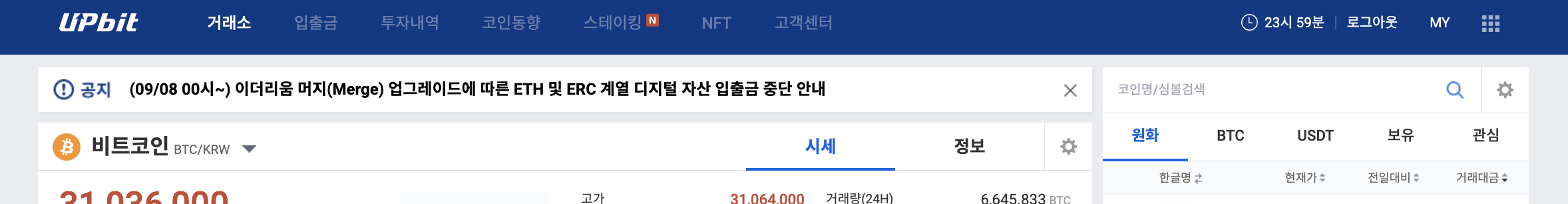 먼저, 업비트 거래소 메인 페이지 우측의 "MY" 메뉴를 선택해주세요.