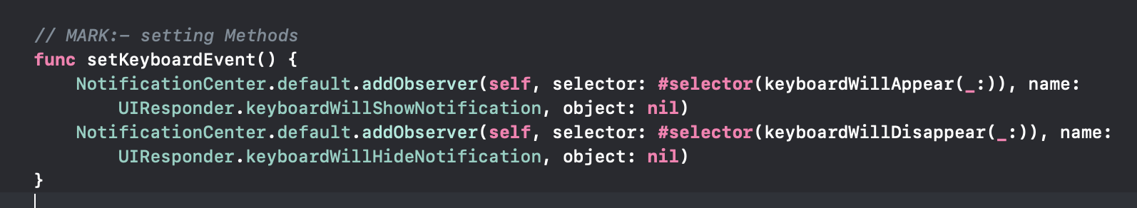 해당 사용되는 컨트롤러뷰 내 초기화 부에 위와같은 노티피케이션 등록을 해주면 됩니다. 하나는 keybaordWilllAppear(키보드가 등장할때 호출되는 메서드), 또 하나는 keyboardWillDisappear(키보드가 사라질때 호출되는 메서드) 입니다. 각각의 메서드는 키보드 편집기가 등장, 사라지는 시점에서 호출이 될 수 있는데요.