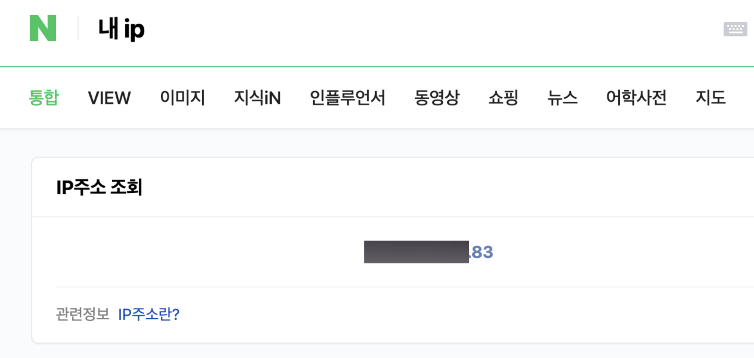 본인이 자주 사용하는 환경에서 본인의 IP 확인을 하고 싶다면, 네이버에서 "내 ip"를 검색하시면 쉽게 확인하실 수 있습니다.