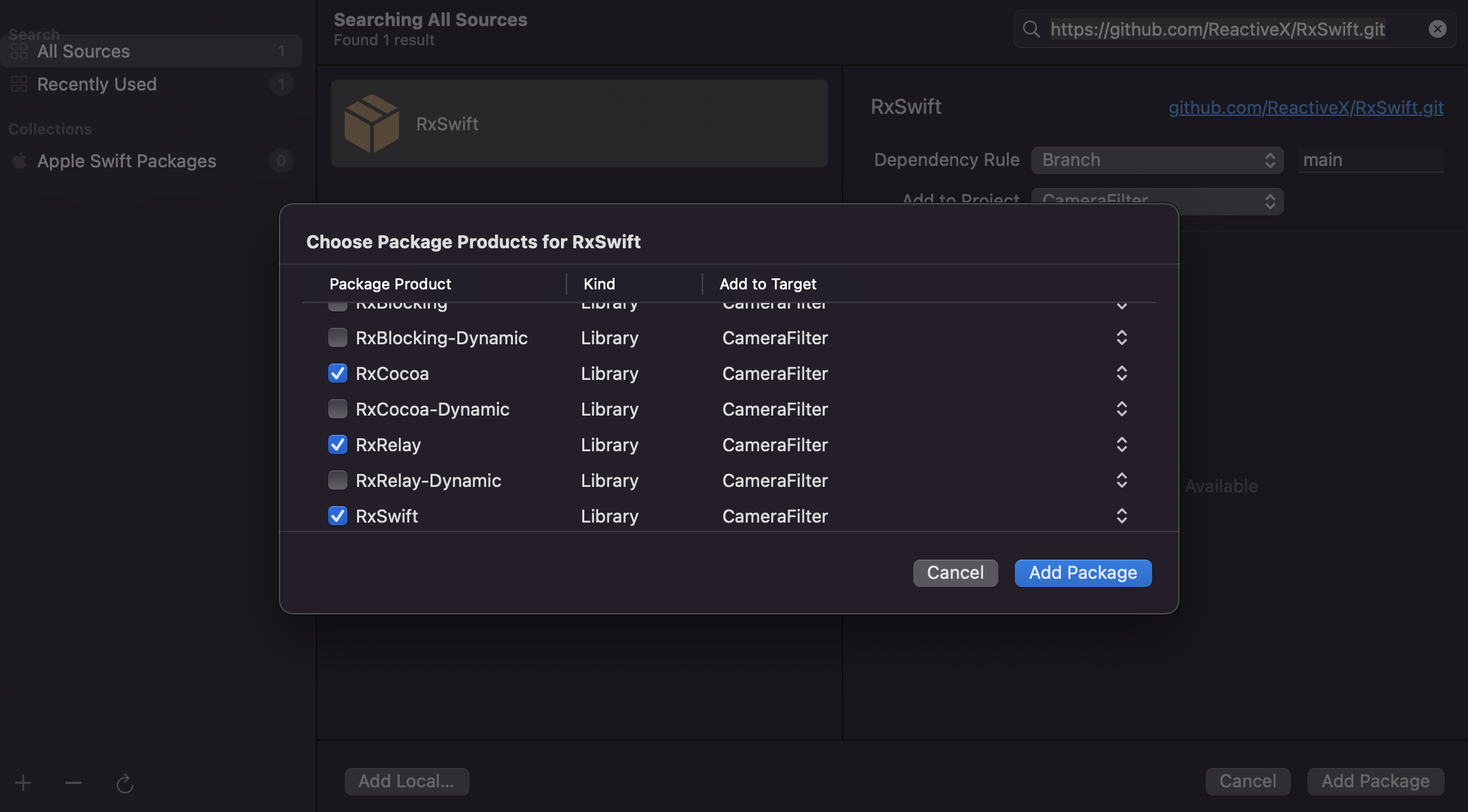 라이브러리 설치를 할때 위와 같이 다양한 Package Products가 존재하는 경우가 있습니다. 이때 필요한 옵션을 선택한 후, "Add Package" 버튼을 선택해줍니다.