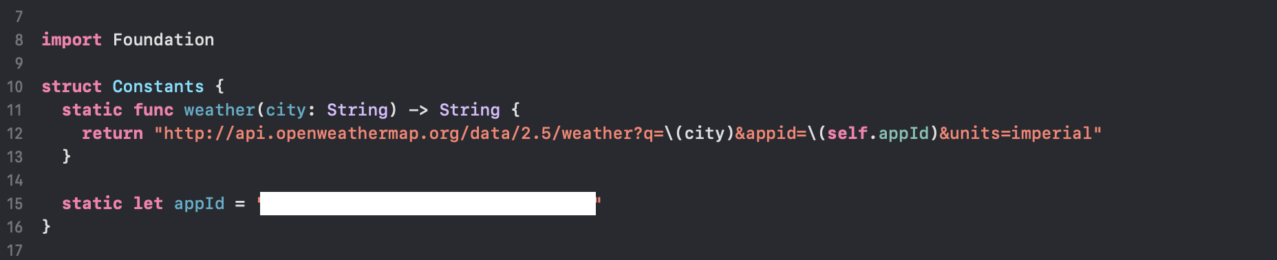 먼저, Constants 파일을 생성하고 API 요청에 필요한 URL 주소를 정의합니다. 무료 open API이지만, 사이트에 가입해서 고유 키를 발급받아서 사용해야합니다. 또한, 검색하고자 하는 city 명을 인자로 받아서 URL 주소에 추가해주어야합니다.