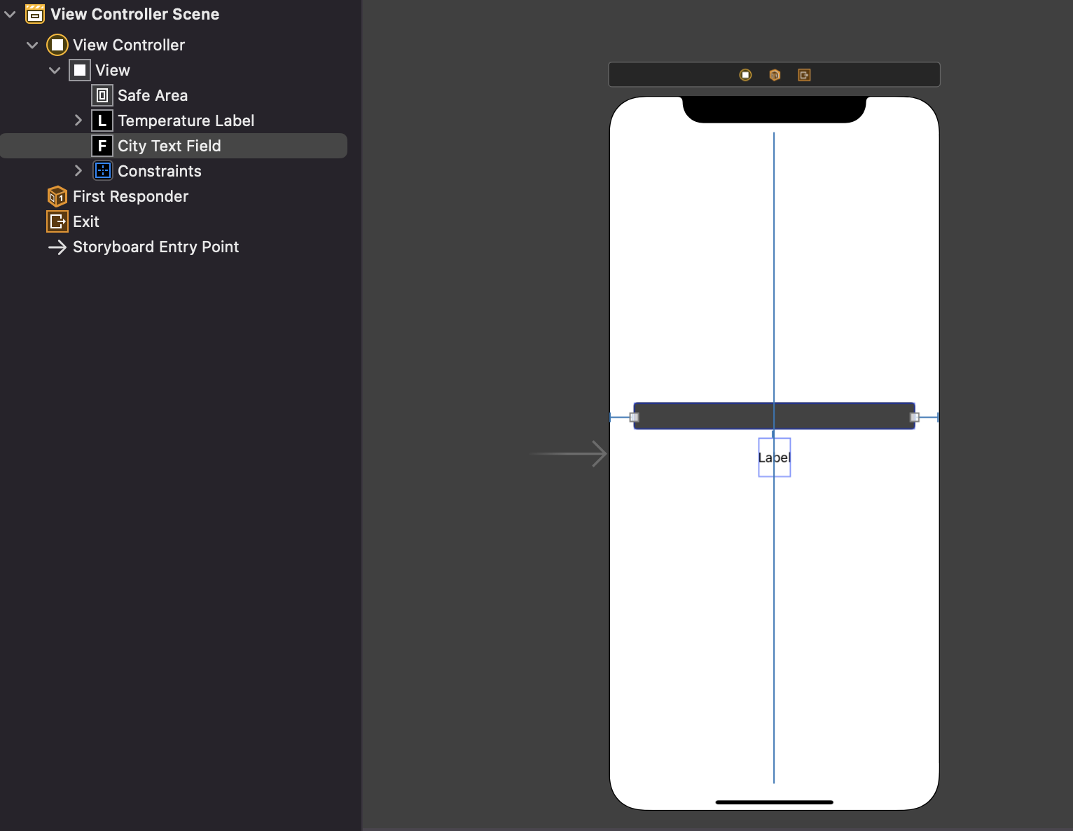 프로젝트의 기본 ViewController: UIViewController에 뷰를 구성합니다. 텍스트필드에 city 명을 입력하면 관련 정보가 나오도록 할 생각입니다. 위와 같이 UILabel, UITextField를 추가한 후, 앞서 정의한 WebService 인스턴스를 추가합니다. viewDidLoad에 사용되는 setupPublisher 메서드 구현은 아래에서 진행됩니다.