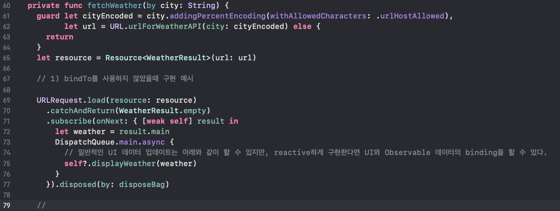69 ~ 77행) URLRequest+Extension.swift에서 구현한 load<T>(resource:) 메서드를 사용합니다. url에 맞는 API요청을 하는데, 에러가 발생하면 placeholder로서 WeatherResult.empty 객체를 반환합니다. 이후 구독을 통해 이벤트 결과를 UI에 적용하는 displayWeather 메서드를 호출하는 모습입니다. 여기서도 구독이 발생했으니 구독정보 관리를 위해 disposed(by:)코드를 적용해줍니다.