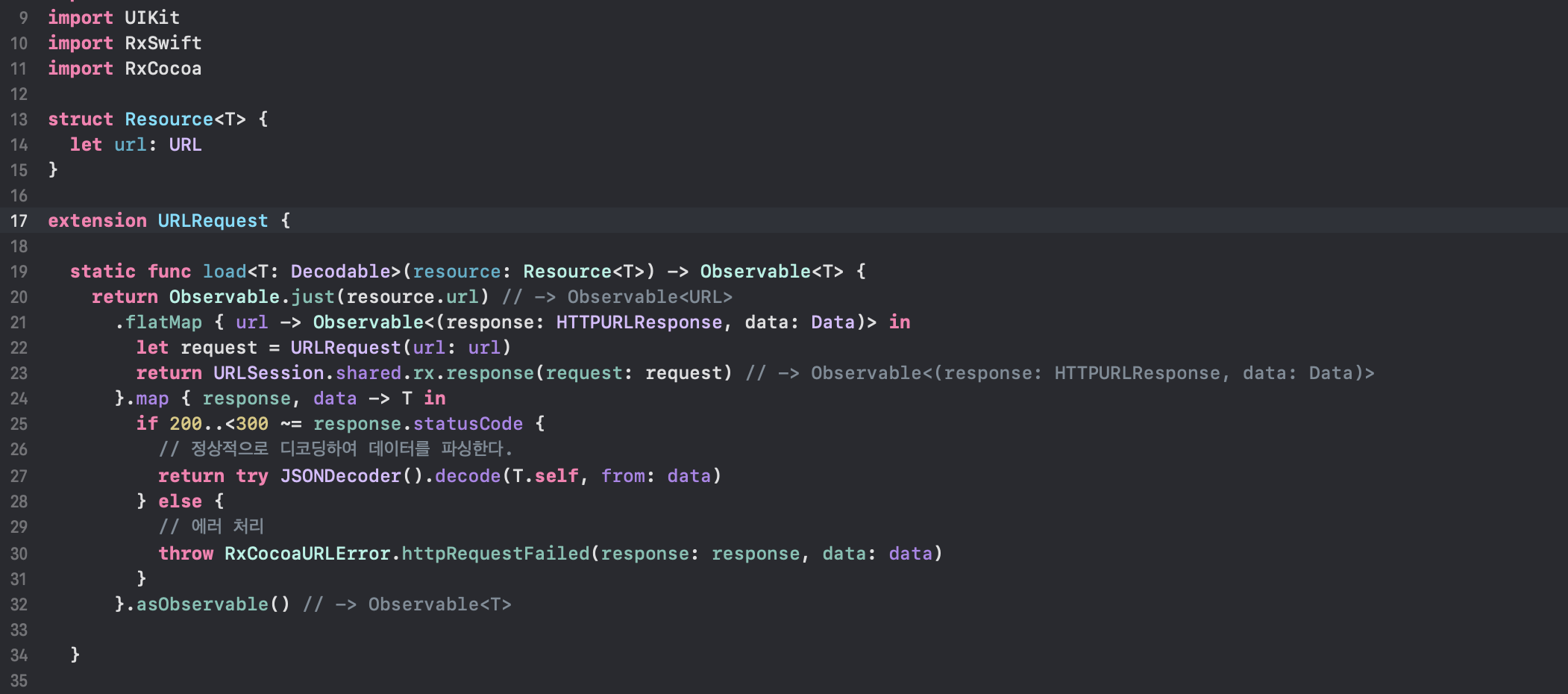 19행) load 타입 메서드를 정의합니다. Decodable 프로토콜을 준수하는 제네릭 타입의 Resource를 인자로 받아서 Observable<T> 타입으로 반환하며, View에서 사용될 예정입니다.