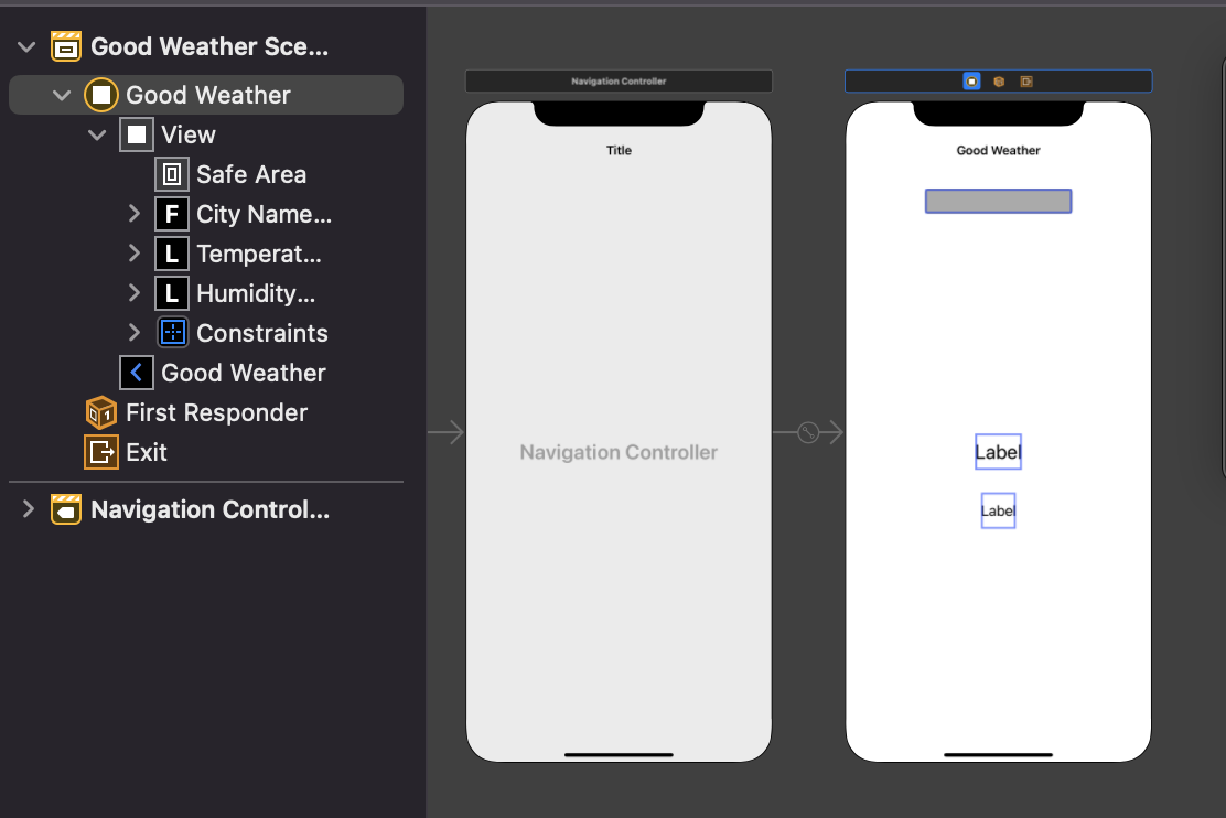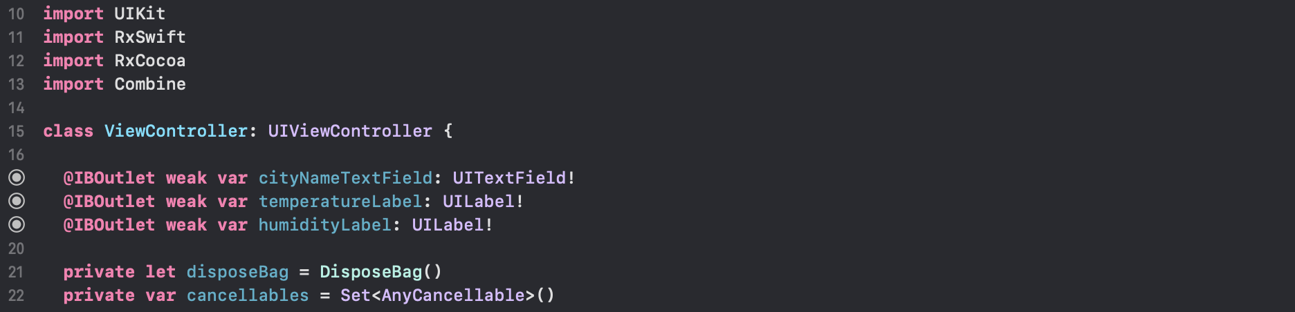 먼저 city이름을 입력할 UITextField, 입력한 city 이름에 맞는 온도, 습도를 보여줄 UILabel 2개를 추가해주세요. 또한 Obseravble 구독, 바인딩 정보(Disposables)를 담아서 메모리 관리를 할 disposeBag을 선언해주세요.