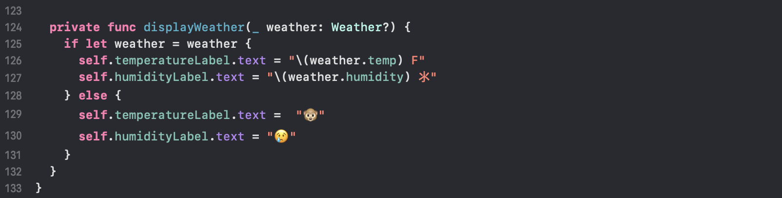 API 응답을 받았을 경우, UILabel에 해당 정보를 뿌려주는 메서드입니다. 값이 있으면 온도, 습도를 설정하고, 없을경우 그에 맞는 텍스트를 지정해주면 됩니다.