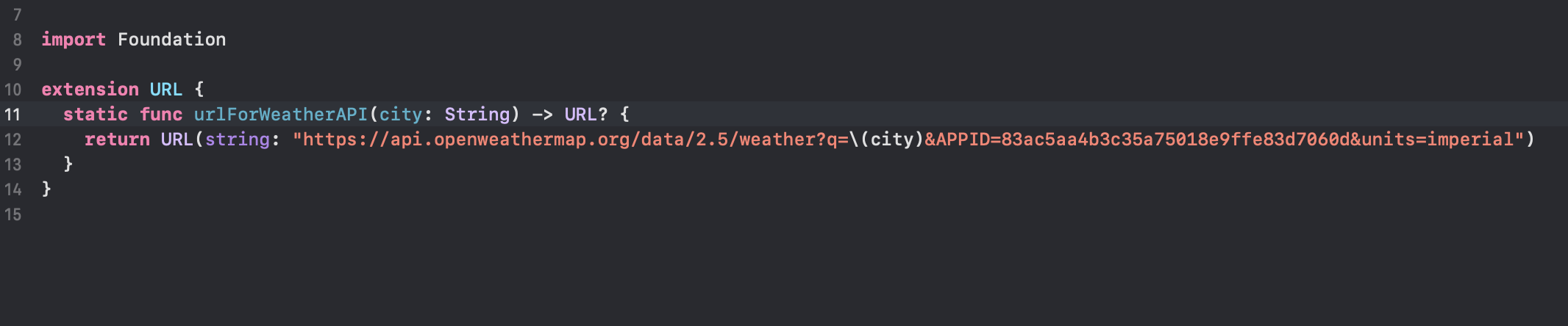 URL extension에 Weather open API URL을 반환하는 메서드를 정의합니다. 특정 city를 인자로 받아서 그에 맞는 날씨 정보를 제공하는 API입니다. 이어서, 저희가 사용할 날씨 API 응답 JSON 포맷 예시를 보겠습니다.