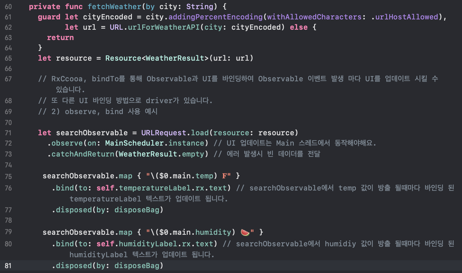 31 ~ 41행) 텍스트필드의 입력 텍스트가 비어있지 않다면, fetchWeather(by:) 메서드를 실행해서 API를 요청한 후, 응답을 View에 뿌려줍니다. 현재 구독정보에 대한 메모리 관리를 위해 마지막에는 disposed(by: disposeBag)을 지정해줍니다.