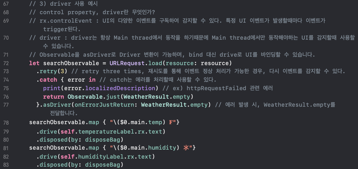 72 ~ 77행) driver를 사용하면 별도의 스레드 지정 코드를 작성할 필요가 없습니다. 그 자체로 메인스레드에서 동작하기 때문입니다. 위 코드에는 별도의 연산자, retry가 들어갔는데 이는 에러가 발생했을때 재시도를 할 수 있도록 해주는 연산자입니다. 예를들어 retry(3)은 3번 재시도를 할 수 있게 해줍니다. drive를 사용하기 위해서는 먼저, asDriver()를 통해 drive()를 사용할 수 있게 만들어야 합니다. 이때 onErrorJustReturn을 통해 에러발생 시 placeholder를 지정할 수 있습니다.